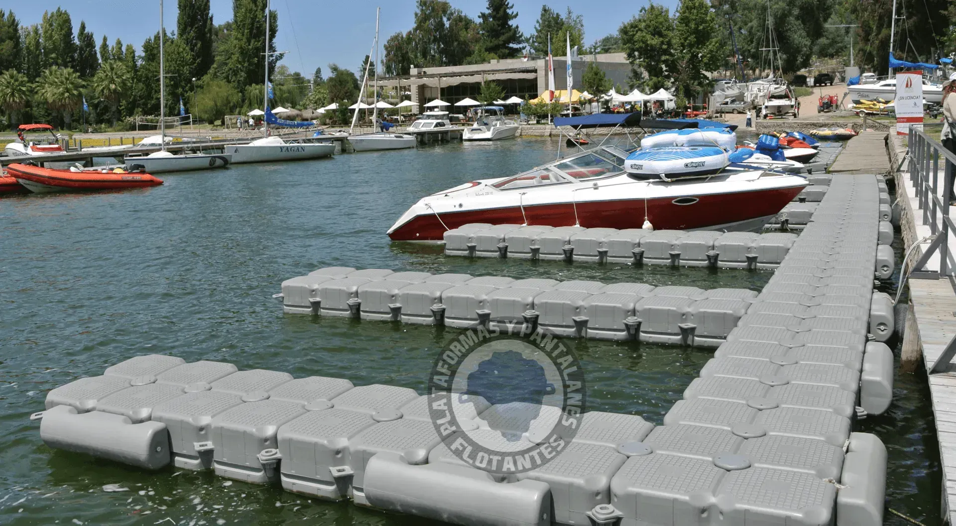 Es una estructura formada por módulos plásticos flotantes, que se conectan entre sí como un puzzle y se anclan en el agua. Se usa como: