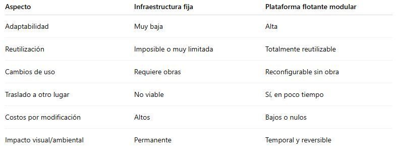 A diferencia de las estructuras fijas, que requieren una demolición o reforma para cambiar su función, las plataformas flotantes modulares: