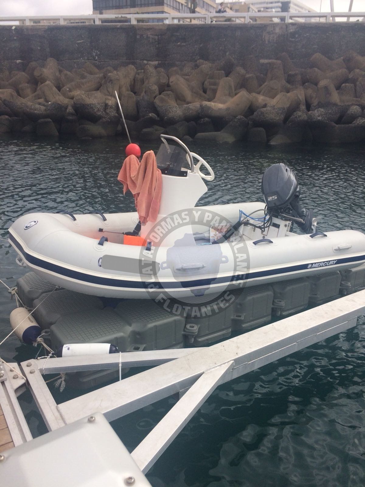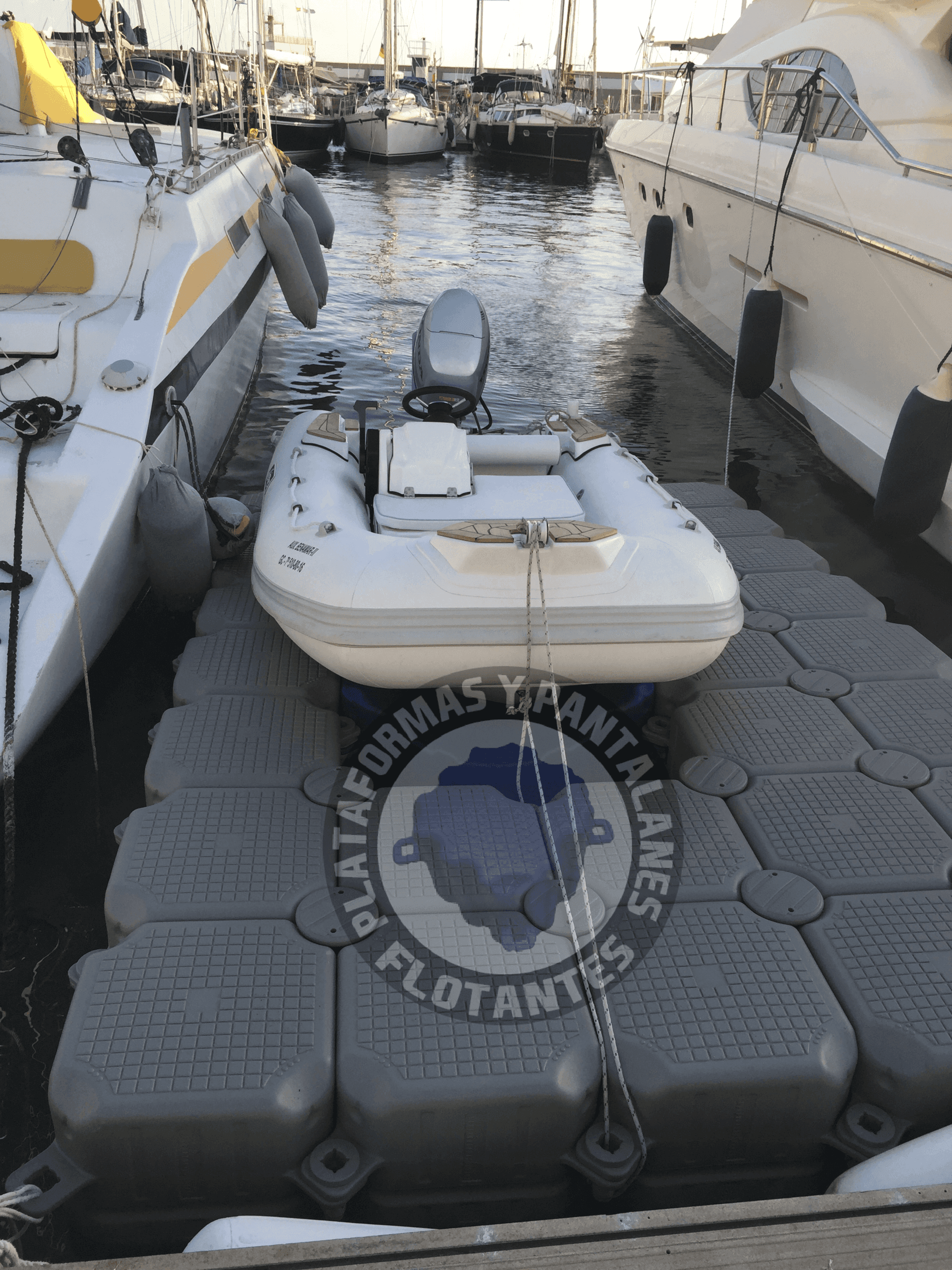 Estes são alguns exemplos de plataformas flutuantes para uma ou várias embarcações com cerca de 3,5 metros de comprimento, feitas com os nossos blocos modulares.
